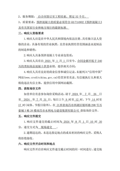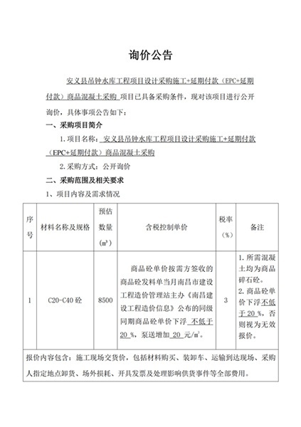 安義縣吊鐘水庫工程項目設(shè)計采購施工+延期付款(EPC+延期付款)商品混凝土采購項目詢價公告