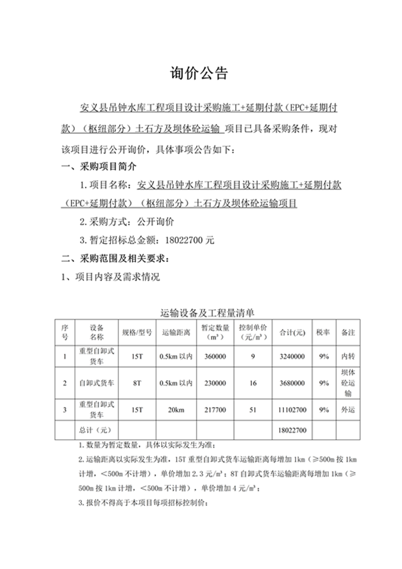 安義縣吊鐘水庫工程項目設(shè)計采購施工+延期付款(EPC+延期付款)(樞紐部分)土石方及壩體砼運輸項目詢價公告