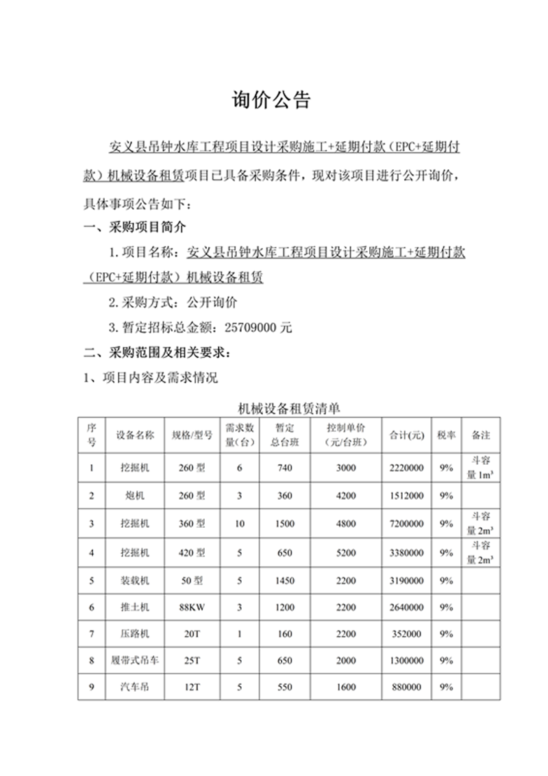 安義縣吊鐘水庫工程項目設(shè)計采購施工+延期付款(EPC+延期付款)機械設(shè)備租賃項目詢價公告