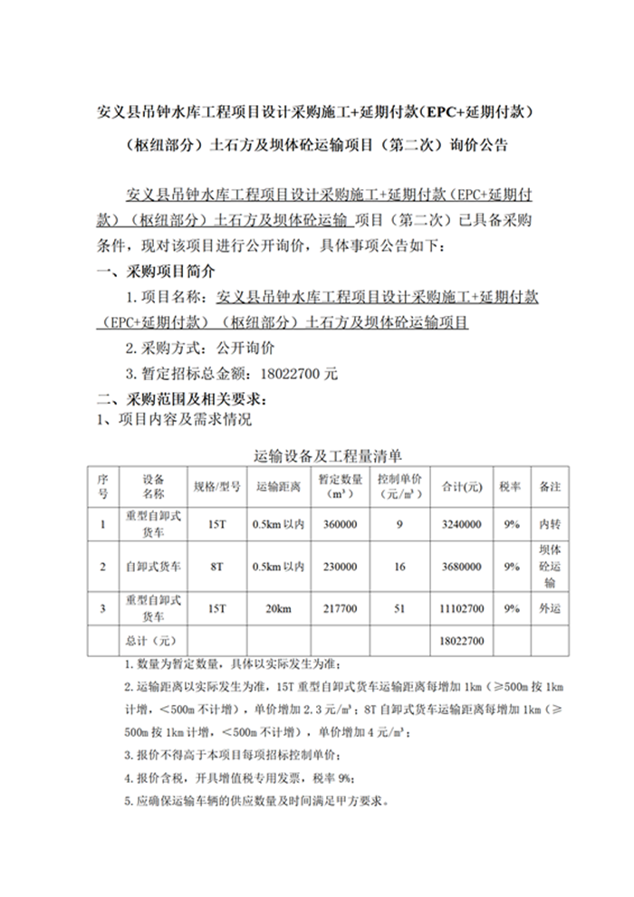名稱:安義縣吊鐘水庫工程項(xiàng)目設(shè)計(jì)采購施工+延期付款(EPC+延期付款)(樞紐部分)土石方及壩體砼運(yùn)輸項(xiàng)目(第二次)詢價(jià)公告