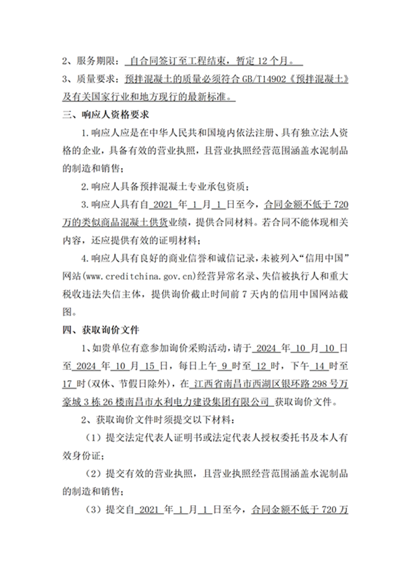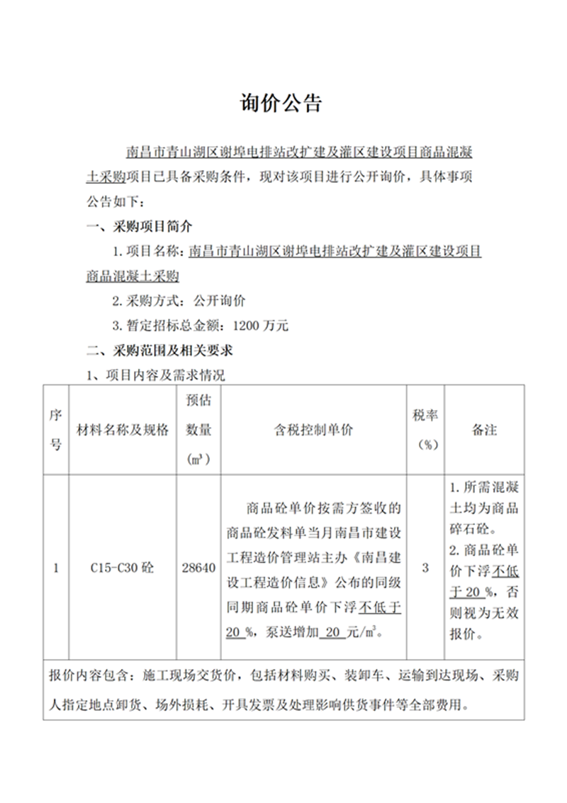 南昌市青山湖區(qū)謝埠電排站改擴建及灌區(qū)建設(shè)項目商品混凝土采購項目詢價公告