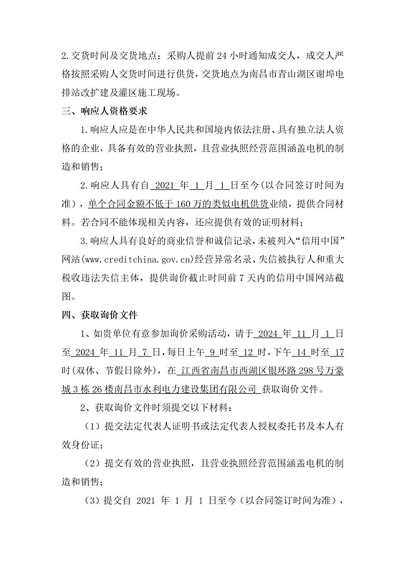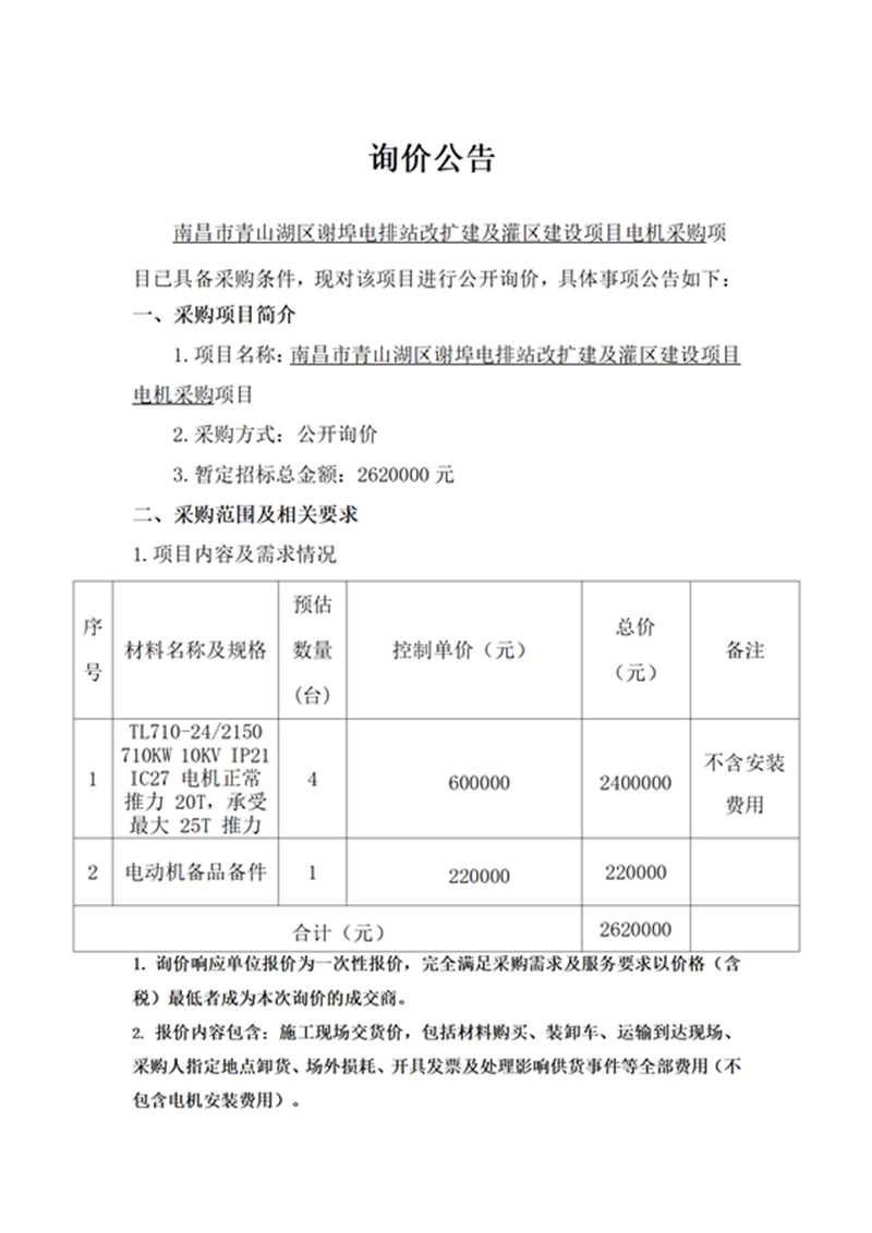 南昌市青山湖區(qū)謝埠電排站改擴(kuò)建及灌區(qū)建設(shè)項(xiàng)目電機(jī)采購項(xiàng)目詢價(jià)公告