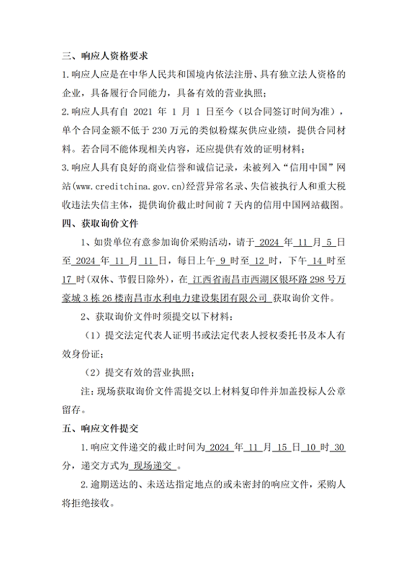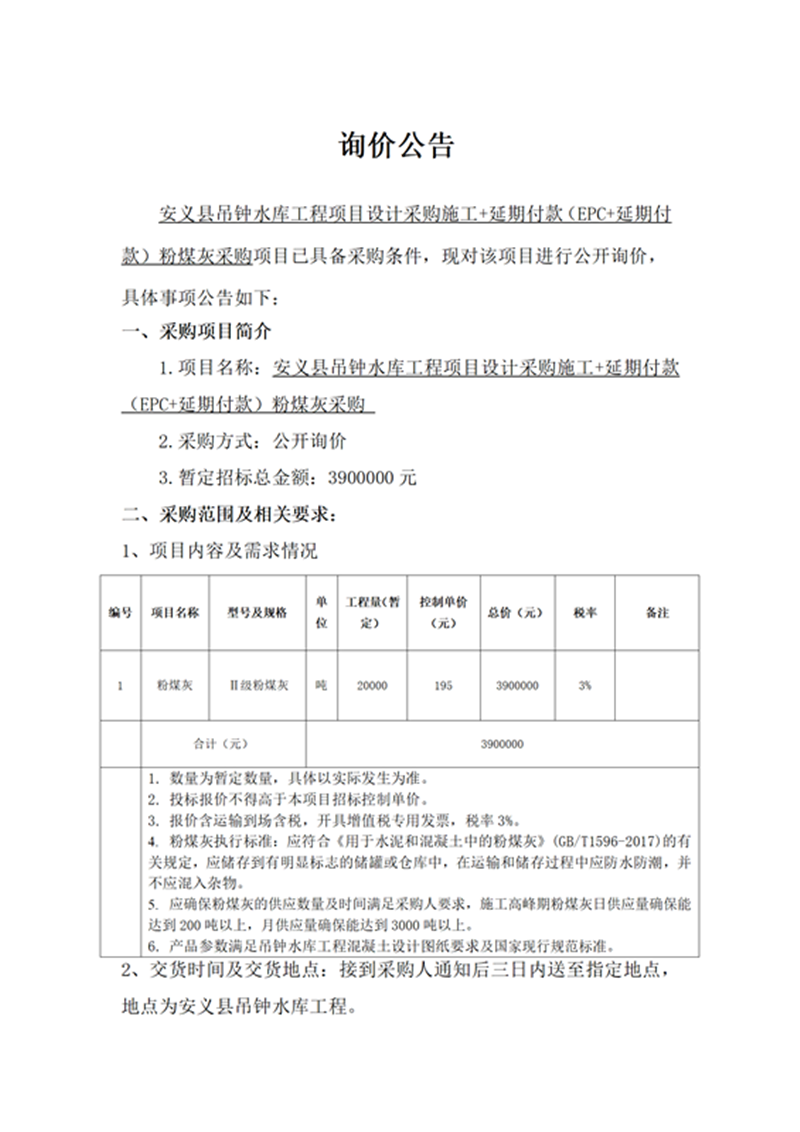 安義縣吊鐘水庫(kù)工程項(xiàng)目設(shè)計(jì)采購(gòu)施工+延期付款(EPC+延期付款)粉煤灰采購(gòu)項(xiàng)目詢價(jià)文件