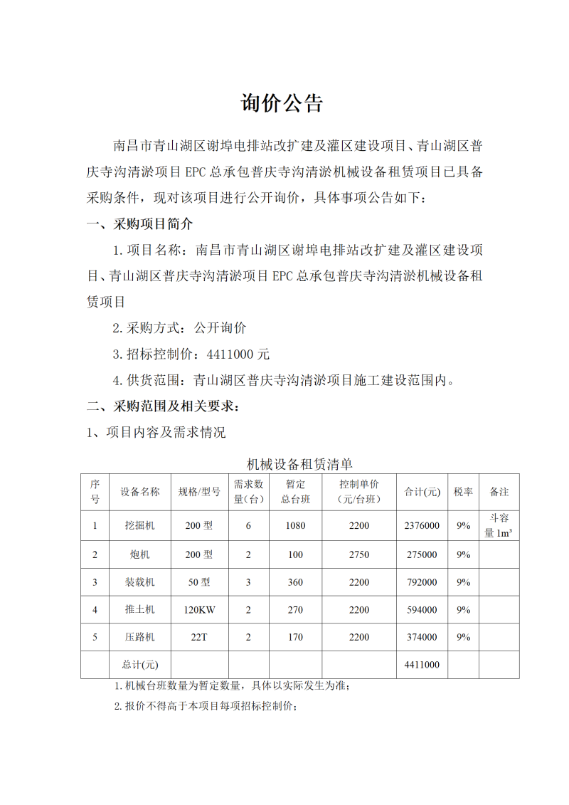 南昌市青山湖區(qū)謝埠電排站改擴建及灌區(qū)建設(shè)項目、青山湖區(qū)普慶寺溝清淤項目EPC總承包普慶寺溝清淤機械設(shè)備租賃項目詢價公告