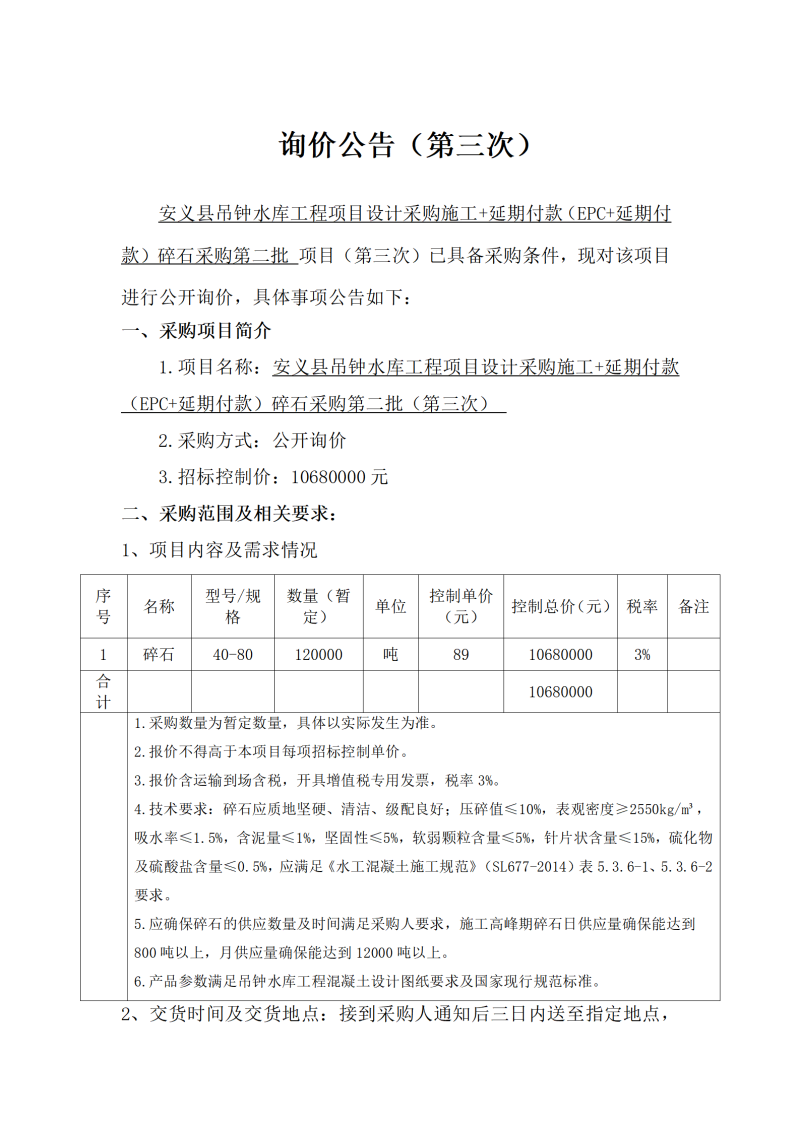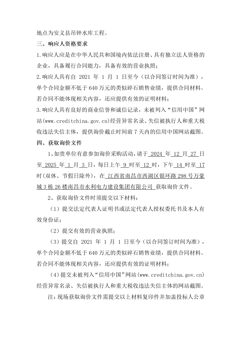 安義縣吊鐘水庫工程項目設(shè)計采購施工+延期付款(EPC+延期付款)碎石采購第二批 項目(第三次)詢價公告