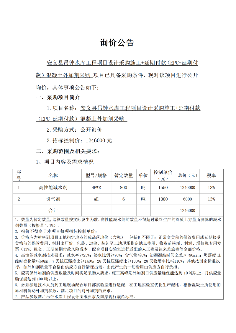 安義縣吊鐘水庫工程項(xiàng)目設(shè)計(jì)采購施工+延期付款(EPC+延期付款)混凝土外加劑采購項(xiàng)目詢價公告
