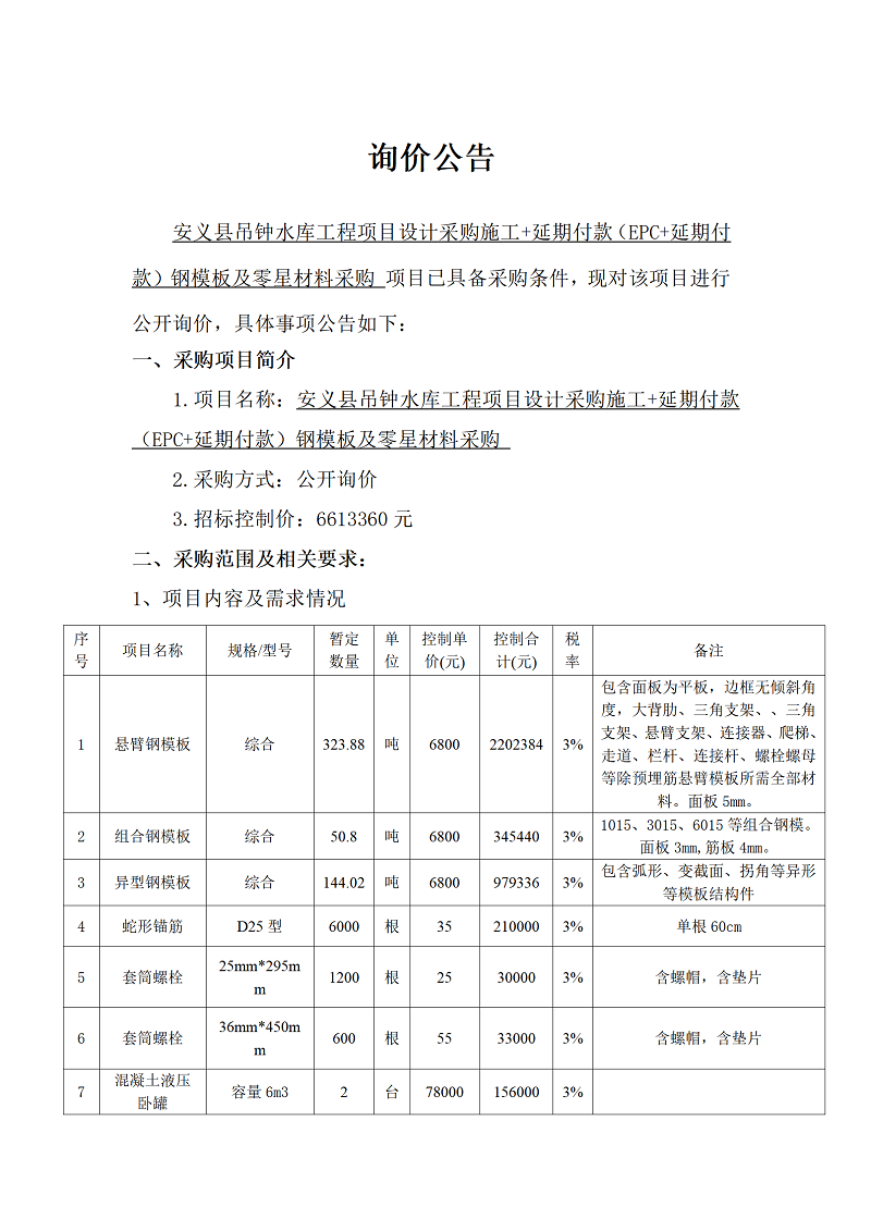 安義縣吊鐘水庫工程項目設(shè)計采購施工+延期付款(EPC+延期付款)鋼模板及零星材料采購項目詢價公告