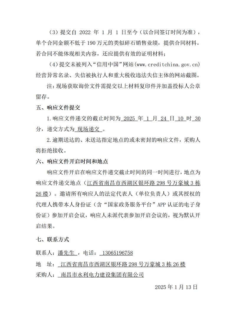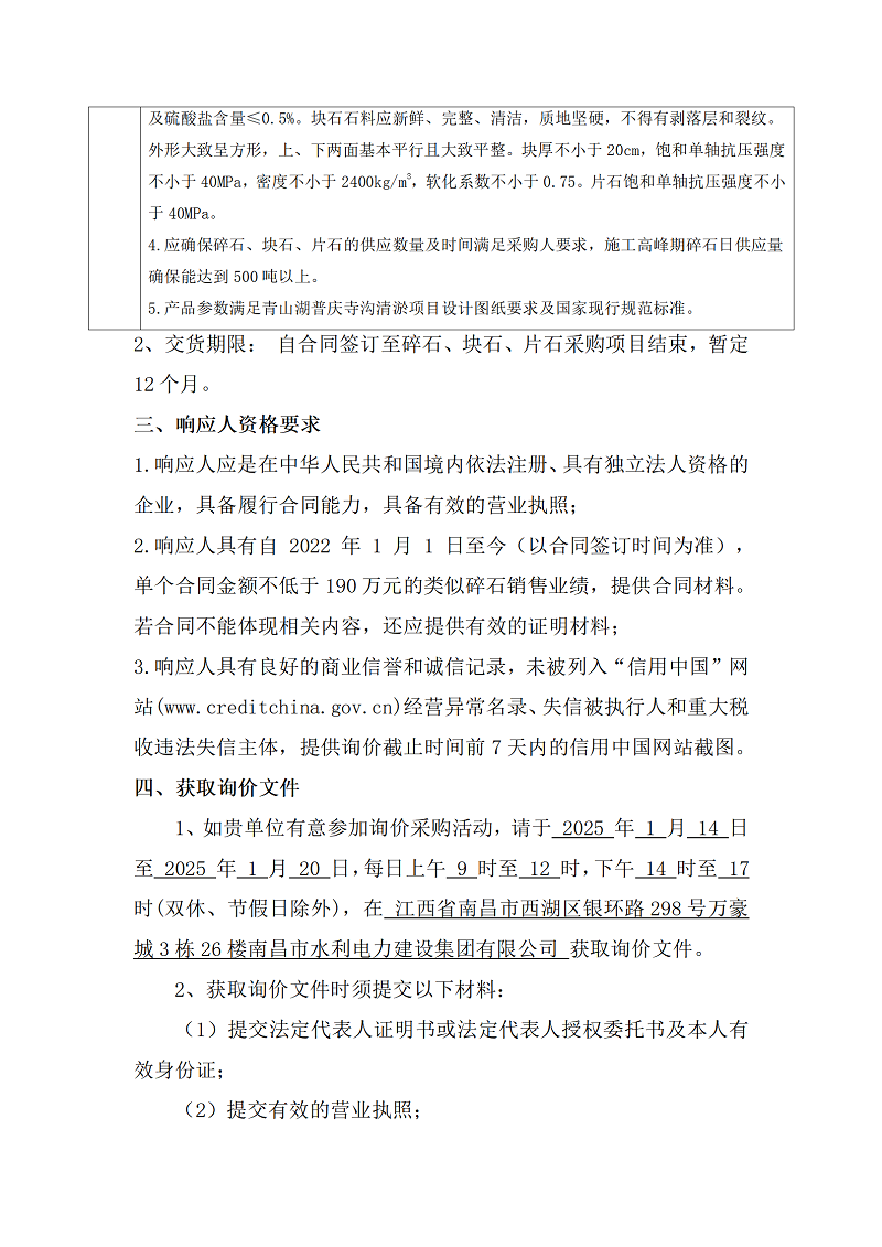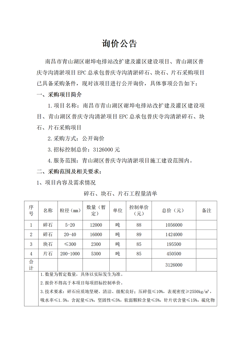 南昌市青山湖區(qū)謝埠電排站改擴(kuò)建及灌區(qū)建設(shè)項(xiàng)目、青山湖區(qū)普慶寺溝清淤項(xiàng)目EPC總承包普慶寺溝清淤碎石、塊石、片石采購(gòu)項(xiàng)目詢價(jià)公告